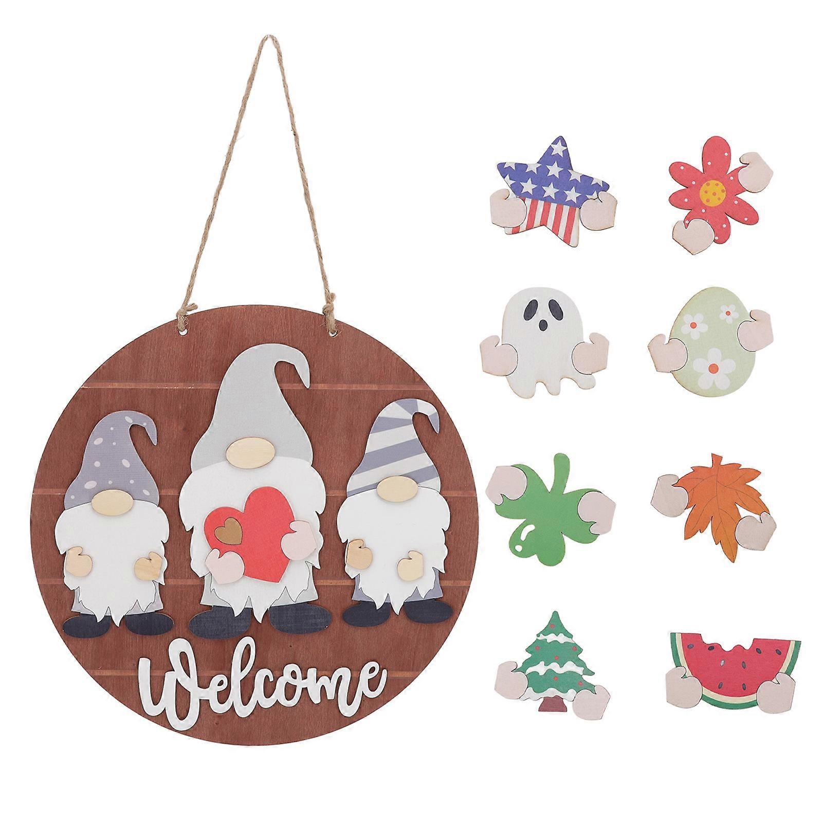 Wooden Door Hanging Sign DIY Gnome Sign with Interchangeable Decors for Independence Day Christmas Halloween