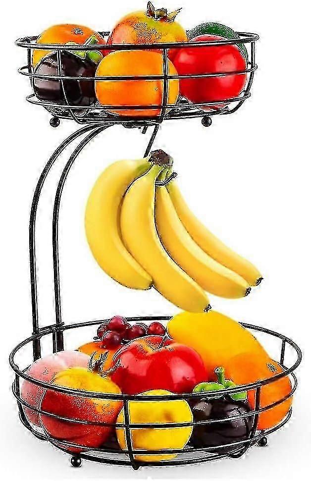 2 Tier Fruit Basket With Banana Holder, Standing Daily Kitchen Modern Fruit Bowl, Practical Fruit Baskets Vegetable Basket Made Of Metal, Black
