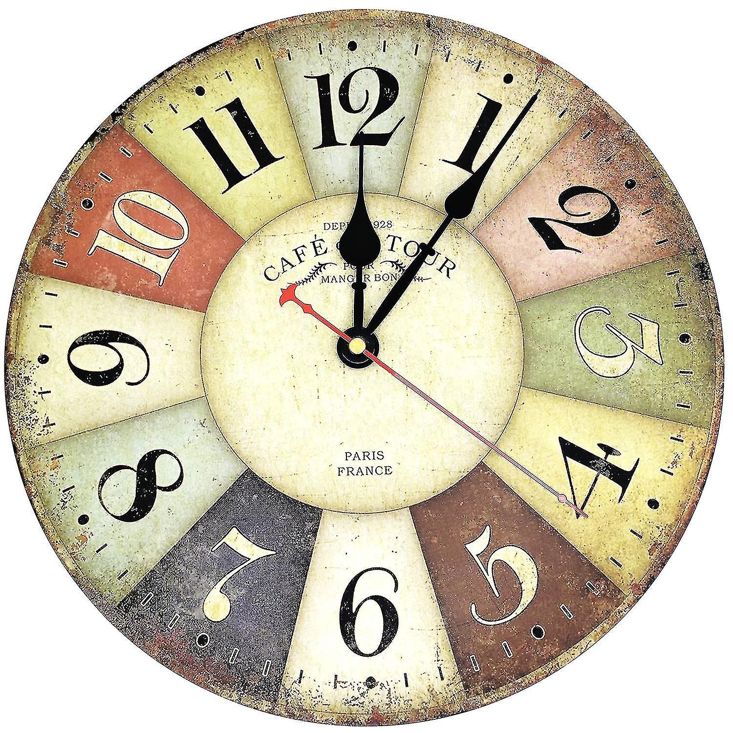 MDF Wooden:The Large Wall Clocks are made of eco-friendly MDF wooden material, no frame and no cover. It's lightweight, keeps the colorful and pretty face for many years. Silent&Non-ticking: The pointer rotates completely without noise, creating a good sleeping and working environment for you. Large Numerals: The large and clear Arabic numerals make it easy to see from any corner of the room. Perfect Decoration: The classic and stylish design makes it suitable for all occasions, such as kitchen, living room, bedroom, family room, meeting room or dining room. It is a perfect decorative wall clock. Battery Operated: 1 AA carbon zinc battery (not included). Do not use alkaline batteries or high-power batteries for long-term use, they will affect the accuracy of the time. The rear slot is designed for easy installation and includes a hook.Products from NIUNIU's store