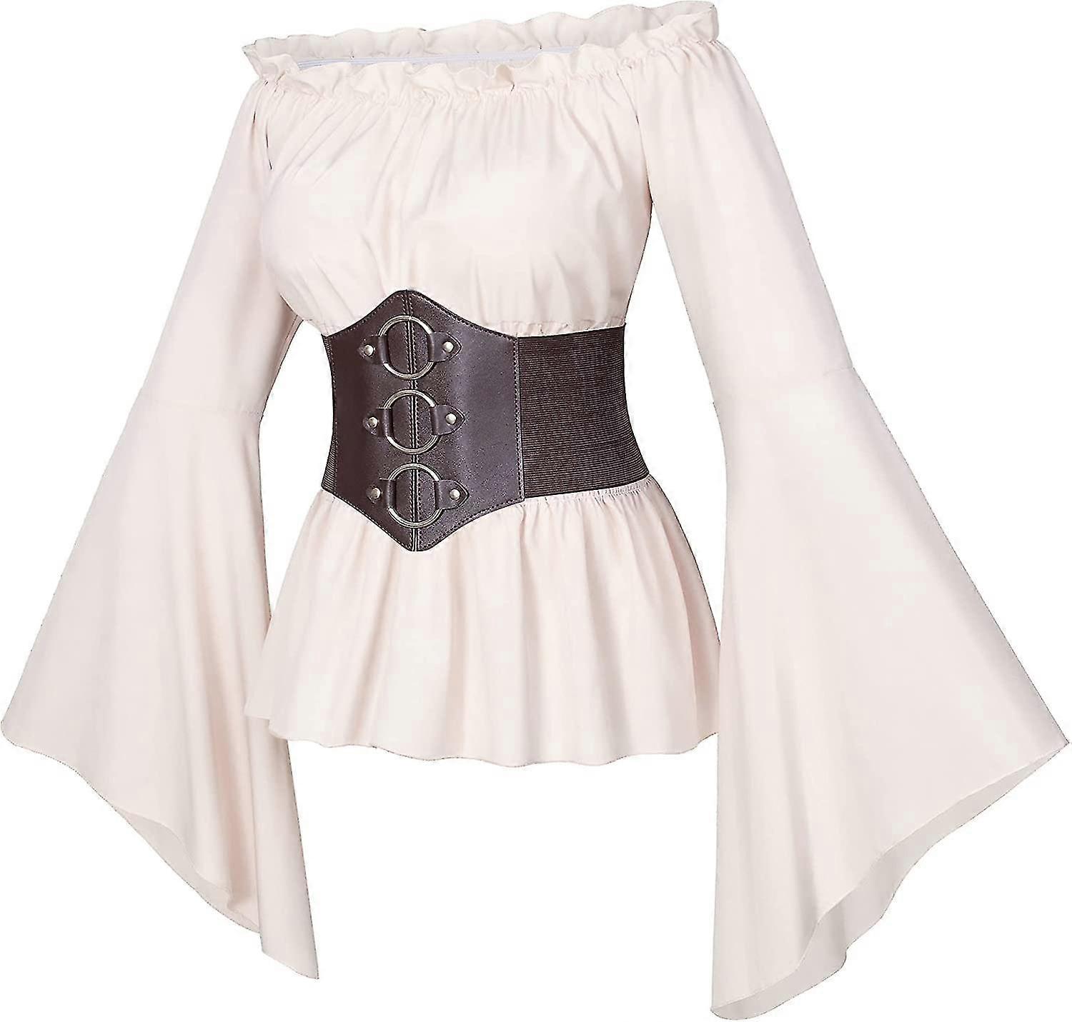 Womens Renaissance Victorian Peasant Ruffle Smocked Waist Boho Pirate Shirt Blouse With Belt Set