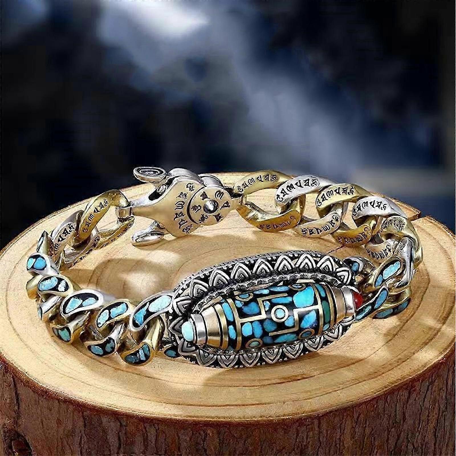 Turquoise Six-character Mantra Nine-eyed Dzi Bead Bracelet, Transfer Rotating Nine Eyes Dzi Beads Bracelet, Meditation Luck Amulet Bracelet