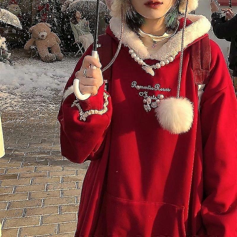 Kawaii Hooded Sweatshirts Harajuku Pullover Christmas Red Hoodie Oversized Sweet Soft Girl Korean Fashion Embroidery Cute