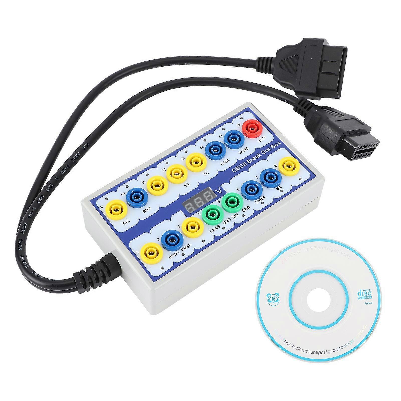 Feature:1. Find errors and diagnose OBD connector link in the process of using the decoder.2. Monitor the voltage and ground of the OBD interface and display low voltage. Shows diagnostic stitching error.3. Jump to OBD interface signal. Signal lines, such as decoders for 7 to 15 vehicles online.4. Quickly check whether each pin of the OBD2 diagnostic connector communicates normally.5. When replacing the battery, plug the OBD2 connector into the car and connect the additional power supply to the control box to ensure that vehicle data will not be lost.Specification:Item Type: OBD Detector Material: ABSIntroduction:OBDII Protocol Detector & Break Out Box mainly used for car OBD line signal judgment and signal transfer. Using car fault diagnosis instrument can quickly determine car OBD signal receiving. Signal may not meet angle can take other signal transfer angle. Application is very convenient and solves risks across the line.This OBDII Protocol Detector & Break Out Box has wide range of applications in diagnostics, key programming and chip tuning. Function:To monitor data steam while performing test on vehicle using a Scan tool. This makes it possible for you to both execute a test and simultaneously monitor the testing process.Display testing voltage on the car or truckDisplay communicating pin numberIs an extension of OBD Diagnostic Link Connector (DLC) For short circuiting of pins To detect isolated circuits problems Is a power extension cord for small DC testers that need an external power source (maximum 1.2 amps.) To test circuits with a meter or scope. To check Power (Pin 16), Chassis Ground (Pin 4) and Signal Ground (Pin 5)Save ECU data when replacing vehicle battery..Package List:1 x OBD Box1 x Connection Cable1 x CD
