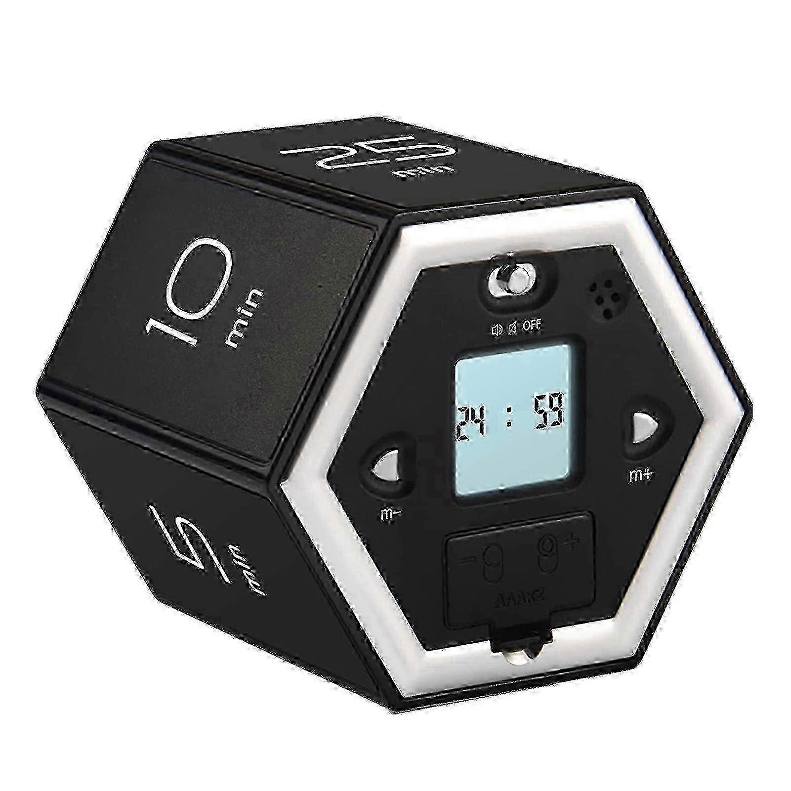 If you loose track of time while doing something and dont want the inconvenience of pressing/touching individual buttons to set up a timer, this is the one for you!<br> <br> Features:<br> Simple to UseJust flip to a particular side for pre-set desk timers, done! No need to press button over and over when you need the standard 1, 5, 10, 25, 30, 60 minutes. You can also set the preset time according to personal need. (2 of the AAA BATTERIES NOT INCLUDED)<br> Dual Timing ModesThe hexagon timer offers countdown and count-up modes. Apart from the 6 preset countdown and custom countdown, you can start count-up mode by placing the timer bottom up, and stop it by standing the screen up. The timer range is 00:01 to 99:59. Easy timer setup for maximum comfort.<br> Suitable for Various ScenariosThe digital timer is a perfect tool for office, work, meetings, kids, study, reading, workout, cooking, and more. Needless to say, this timer can be used in thousands of scenarios!<br> Mute & Adjustable Sound AlertSimply flip the work timer over to the front screen to pause the countdown. To resume the countdown, just flip it again. Set the sound to your desired level of volume, and choose from mute and adjustable sound alert. More options, more convenience.<br> Compact and MagneticIt's portable and fits in any pocket or bag. The timer has a magnetic top that can attach to the fridge or any metal surface, freeing your hands while tracking time.<br> Start Track of Your TimeScreen facing up and slide the switch to the silent mode or ring mode, the screen will light up. Then WAIT 5 SECONDS to flip it and start tracking your time. If the preset time on the productivity timer is not what you want, you can press "M+'' or ''M-'' to add or subtract minutes. After the countdown starts 5 seconds, the minute adjustment function will not be available.<br> <br> Specifications:<br> Color: Black, White, Silver (Optional)<br> Material: ABS+PCB<br> Reminder Duration: 15 seconds<br> Six-sided Fixed Countdown: 1min, 5min, 10min, 25min, 30min, 60min<br> Countdown Time Adjustment: 1 ~ 99min adjustable<br> Power Supply: 2 * AAA batteries (Not included)<br> Item Size: 75 * 65 * 65mm / 2.95 * 2.56 * 2.56in<br> Item Weight: 83g / 2.93oz<br> Package Weight: 100g / 3.53oz<br> Package Size: 8.3 * 7.3 * 7cm / 3.27 * 2.87 * 2.76in<br> <br> Package List:<br> 1 * Hexagon Digital Clock Timer<br> 1 * User Manual (English) Note: Due to the light and screen setting difference, the item's color may be slightly different from the pictures. Please allow slight dimension difference due to different manual measurement.