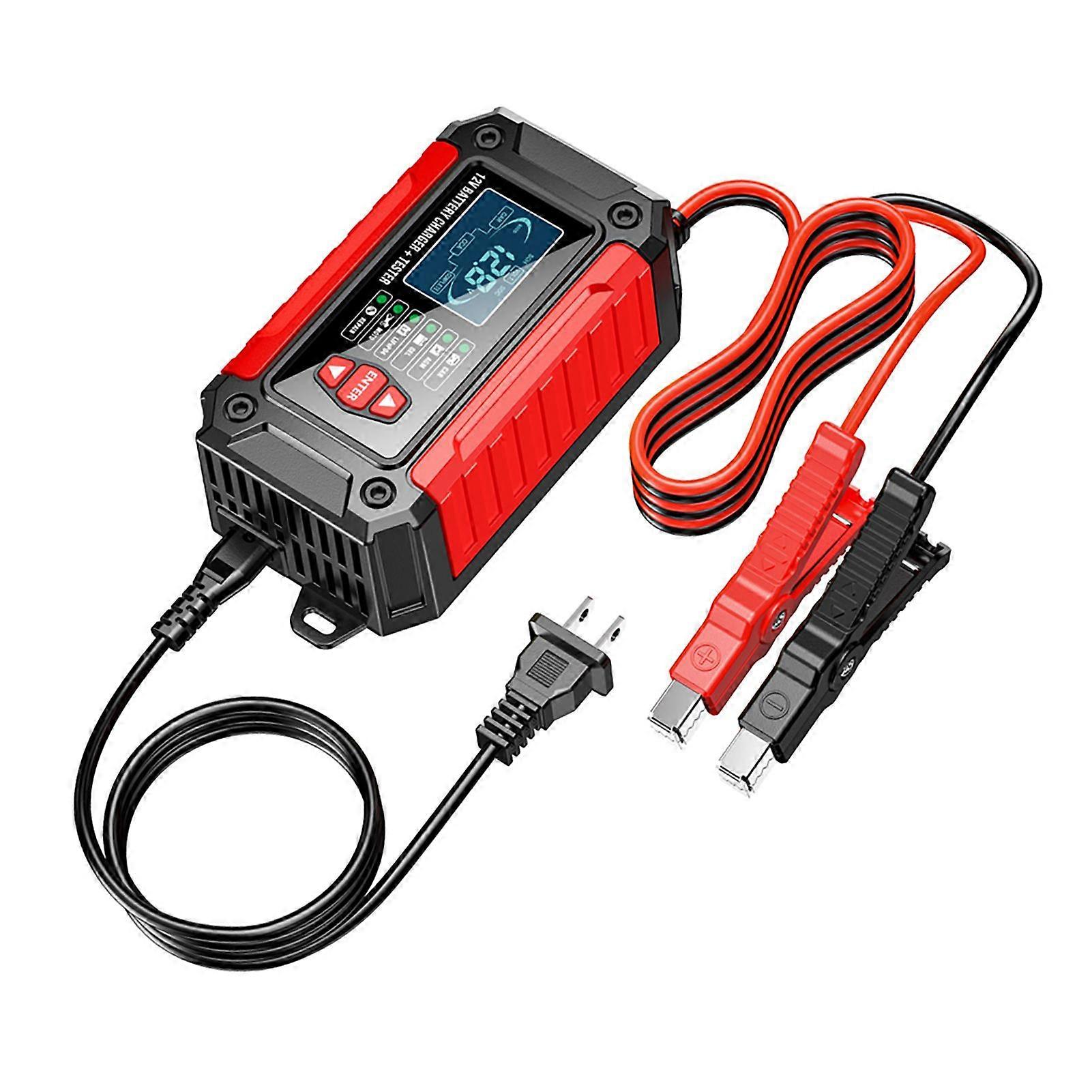 Feature 1Versatile 2-in-1 Solution: The 2-in-1 Battery Chargers and Tester is designed to not only repairs and activate undercharged, idle, or non-rechargeable batteries, but also to detect battery capacity (SOC) and health status (SOH), preventing unexpected breakdowns during your journey. 2Intelligent Charging Technology: With automatic temperature detection, the charging device will automatically switch between winter and summer modes, selecting the optimal charging voltage based on the ambient temperature. This smart feature ensures efficient and hassle-free charging without the need for manual adjustments. The built-in CPU precisely controls the charging process, automatically stopping when the battery is fully charged for added peace of mind. 3Enhanced Safety Protections: Equipped with an intelligent chip, it provides quick and accurate diagnostics with high precisions. It offers multiple safety protections, including overheating, overcurrent, electric shock, short circuit, reverse connection, overvoltage, low voltage, and fire preventions. These safety features eliminate potential hazards and provide a worry-free charging experience. Features: Versatile 2-in-1 Solution: The 2-in-1 Battery Chargers and Tester is designed to not only repairs and activate undercharged, idle, or non-rechargeable batteries, but also to detect battery capacity (SOC) and health status (SOH), preventing unexpected breakdowns during your journey. Intelligent Charging Technology: With automatic temperature detection, the charging device will automatically switch between winter and summer modes, selecting the optimal charging voltage based on the ambient temperature. This smart feature ensures efficient and hassle-free charging without the need for manual adjustments. The built-in CPU precisely controls the charging process, automatically stopping when the battery is fully charged for added peace of mind. Enhanced Safety Protections: Equipped with an intelligent chip, it provides quick and accurate diagnostics with high precisions. It offers multiple safety protections, including overheating, overcurrent, electric shock, short circuit, reverse connection, overvoltage, low voltage, and fire preventions. These safety features eliminate potential hazards and provide a worry-free charging experience. User-Friendly Design: Featuring a large 1.9-inch LCD display, the battery charge device provides clear and easy-to-read results in real-time, including current voltage, current, battery level, temperature, and winter/summer mode. The logical keypad operation allows for convenient and quick settings adjustments. Reliable Quality: Adopts ABS flame-retardant casing, it is fireproof, shockproof, corrosion-resistant, durable, and comfortable to hold. Features high-performance intelligent silent fan cooling system for quiet and efficient charging, significantly extending the chargers lifespan. Wide Compatibility: It is suitable for a wide ranges of applications, including 12V automotive/motorcycle batteries, AGM batteries, EFB batteries, deep cycle batteries, WET batteries, leadacid batteries, and LifePO4 batteries. Its versatility makes it an essential tool for any vehicle owner or mechanic. Specifications: Color: Red Material: ABS Input Voltage: AC100-240V, 50/60Hz Output Voltage: DC12V Output Current: Max. 6A Minimum Starts Voltage: 8.0V Battery Charge Ranges: 4-120Ah Battery Test Ranges: 4-200Ah Thermal Protects: 65±5 Efficiency: App. 85%. Output Cable Length: 600mm/ 51.2in Input Cable Length: 950mm/ 55.1in Item Size: 177 * 86 * 57mm/ 7.0 * 3.4 * 2.2in Item Weight: 465g/ 33.7oz Package Size: 230 * 130 * 65mm/ 9.1 * 5.1 * 2.6in Package Weight: 570g/ 20.1oz Packing List: 1 * Battery Charge Device 1 * Manual Package List 1 * Battery Charge Device 1 * Manual
