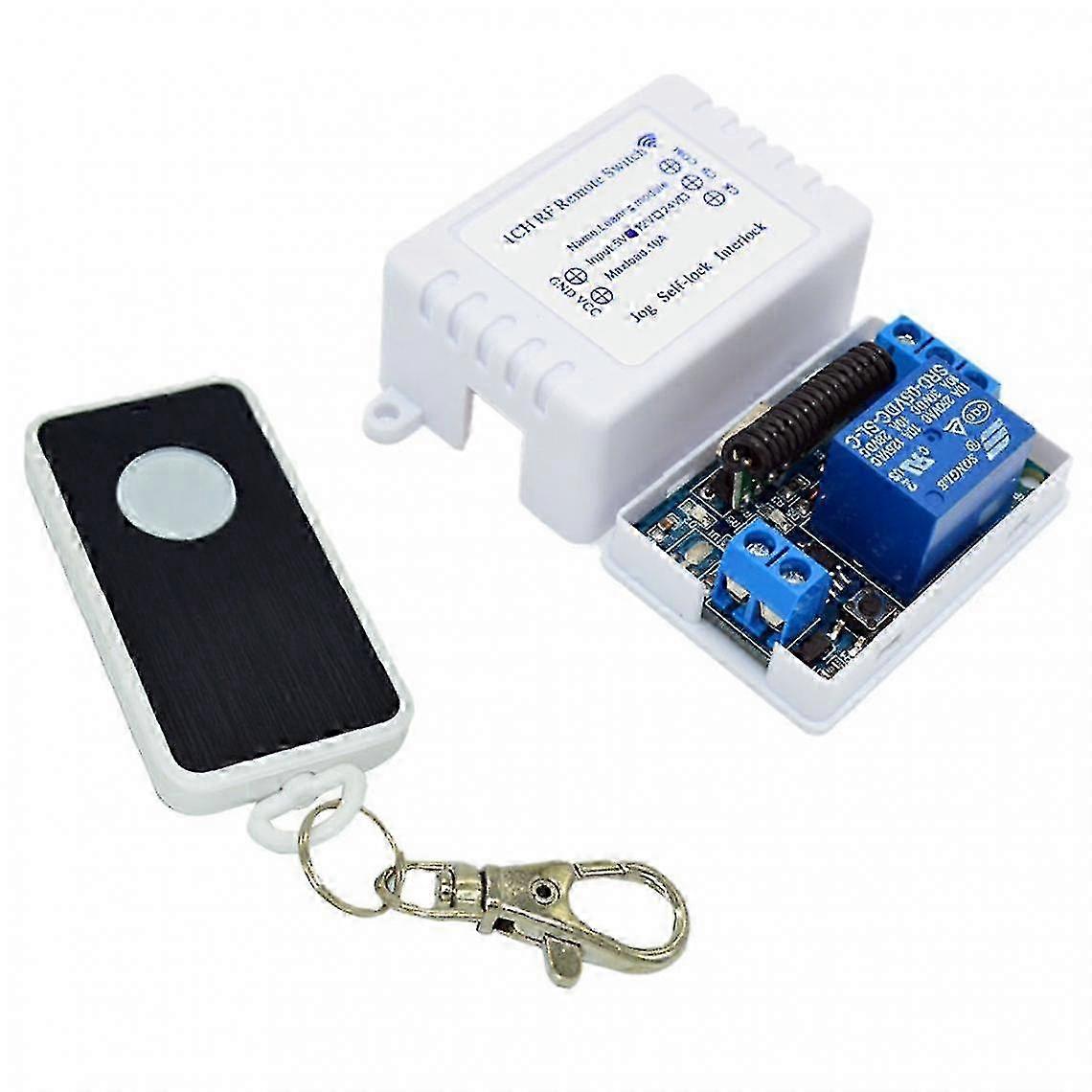 Amp -433m Relay Module 1-ch diy 12v wireless remote control switch 2 key farther Highlights Generic Brand 433m Relay Module 1-ch diy 12v wireless remote control switch 2 key farther The description: Module type: 1 channel 433MHZ learning type; Receiving distance: 15-50 meters Working mode: self-locking, jogging and locking working modes Working instructions: D2 power indicator; D4-relay switch indicator; Indicator D3-learning. Suitable for infrared remote control switch, equipment appliance control switch, to replace manual mechanical switch, power switch, remote control product modification, etc. specification: Working input voltage: 5V/12V/24V VDC: connected to the positive pole of the power supply GND: connected to the negative pole of the power supply Working current: about 32/45/75mA (state of insertion of the relay) Static working current: about 4mA (relay release state) Receiver size: 50x35x22mm / 1.96x1.37x0.86in (with case, case with screw holes) Module type: learning type wireless module 433M Receiving distance: 15-50 meters Output mode: The output is passive output, the module is mainly used as a switch; CK (normally open), COM (common), CB (normally closed) Note: CB and COM are connected under normal conditions. When CB and COM is used as a switch, it is generally not used. Only the two interfaces CK and COM are used. User manual: Self-locking mode: after power on, press and hold the S1 button on the module, the D4 light flashes 1 time, then release the button and press the remote control button to learn; the D4 module LED flashes 3 times and does not flash; At this point, the remote control button is learned successfully, and the module is automatically set to auto-lock mode. Jogging mode: after power on, press and hold the S1 button on the module, the D4 light flashes 2 times, then release the button, then press the button on the remote control to learn; the D4 module LED flashes 3 times and does not flash; At this point, the remote control button is learned successfully and the module is automatically configured in jog mode. Lock mode: after power on, press and hold the S1 button on the module, the D4 light flashes 3 times, then release the button, then press the button on the remote control to learn; the D4 module LED flashes 3 times and does not flash; At this point, the remote control button is correctly learned and the module is configured to only be able to open; After power on, press and hold the S1 button on the module, the D4 light flashes 4 times, then release the button, and press and hold the remote control button to learn; The D4 light flashes 3 times and does not flash; At this point, the remote control button is successfully learned, and the module is configured to only turn off and cannot be turned on; Thus realizing the function of a button to open a button. Clear mode: after power on, press and hold the S1 button on the module, the D4 light flashes 5 times, then release the button; the module is deleted. Package Include: 1 Piece Relay Module with 1 Piece Housing Remote Control