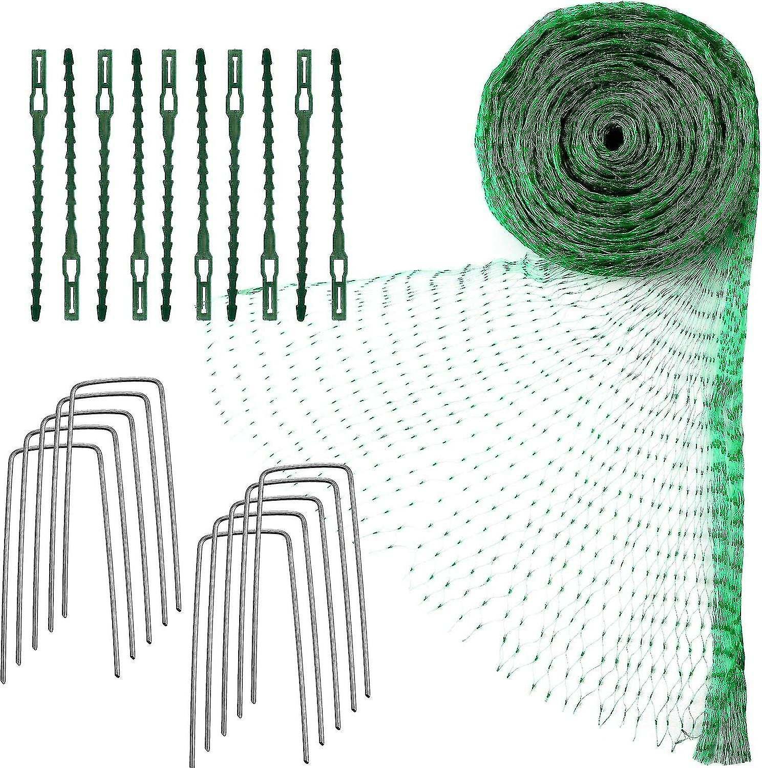 High Quality Materials: The net and the cable tie are made of nylon, which is sopde and durable. The cable tie has a self-locking design and anti-kickback function. It is not easy to cut. The hook is made of steel, which is less punctured or broken than plastic nails. Good anti-rust performance Protective Function: This garden plant net can help you protect plants without harming birds and other animals, protect your vegetables, fruits, crops, etc. It can also be used with garden fences, fence screens or as temporary measures Easy to use: the net is equipped with nylon ties and fixing nails. The accessories allow you to use the net easily and conveniently. Just attach the bird net to the mounting stack and fix the nails to the floor, and use the cable to tie it firmly. Net Size Details: Net measurement approx. 4 x 10m / 13.1 x 32.8ft, the grid size is 15 x 15mm, suitable for the rain and sunlight to pass normally, the tie size is about 11, 5cm / 4.5inch, the nail size is about 100mm in length and 2.5mm in diameter, 40mm wide Package you got: Package included 1 green anti-bird net, several nylon cable ties and 10 U-shaped garden nails, enough for your use
