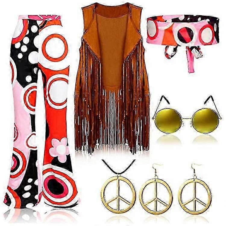 70s Hippie Party Retro Costume Tassel Vest+pants+scarf Suit Newway
