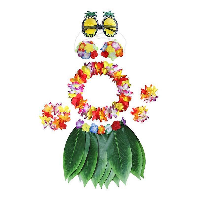 8 Pieces Hawaiian Grass Hula Skirt Costume Set Girl's Necklace Leis Garland Bracelets Bikini