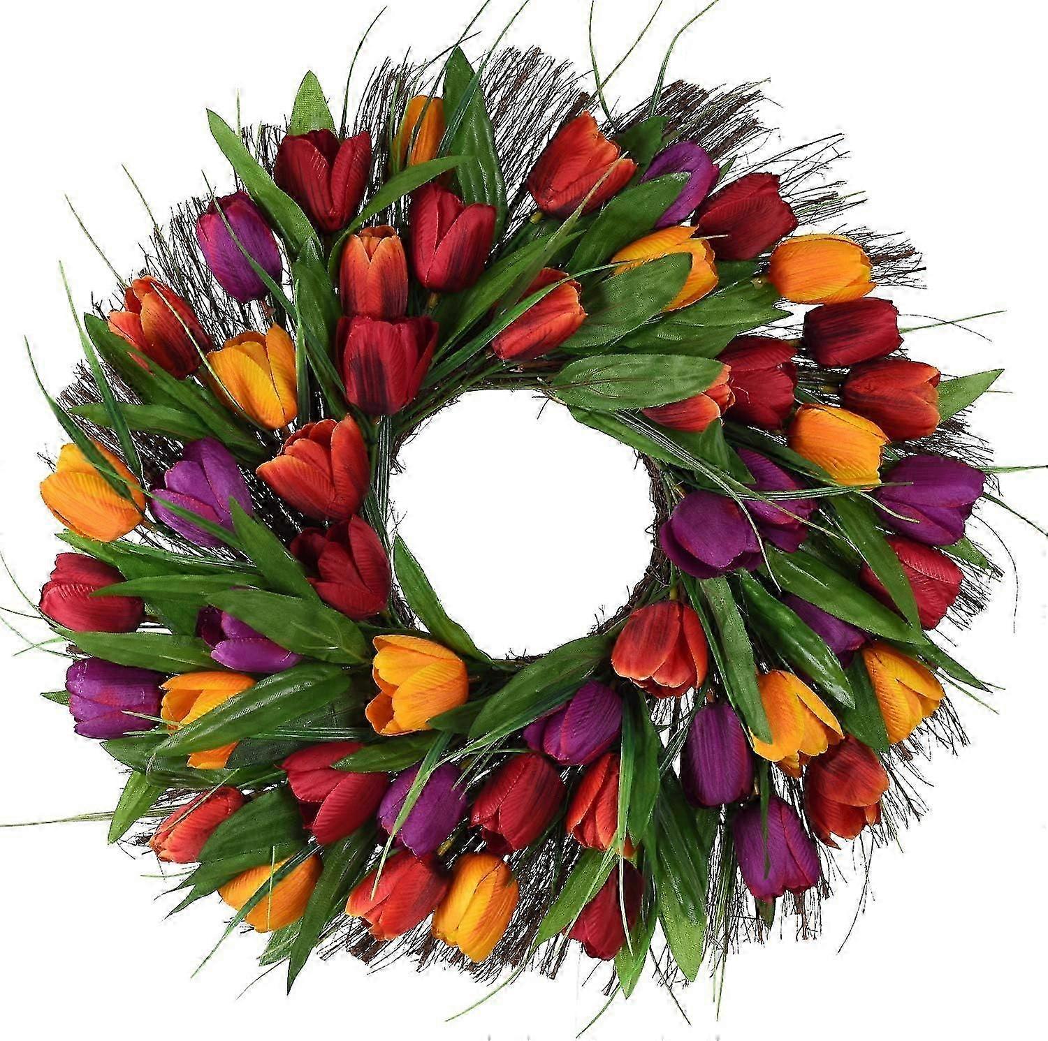 A Symphony of Spring, Lifelike Flowers with No Maintenance Required, Artificial Tulip Wreath for Indoor Outdoor Use, Romantic Look Woven with Spring