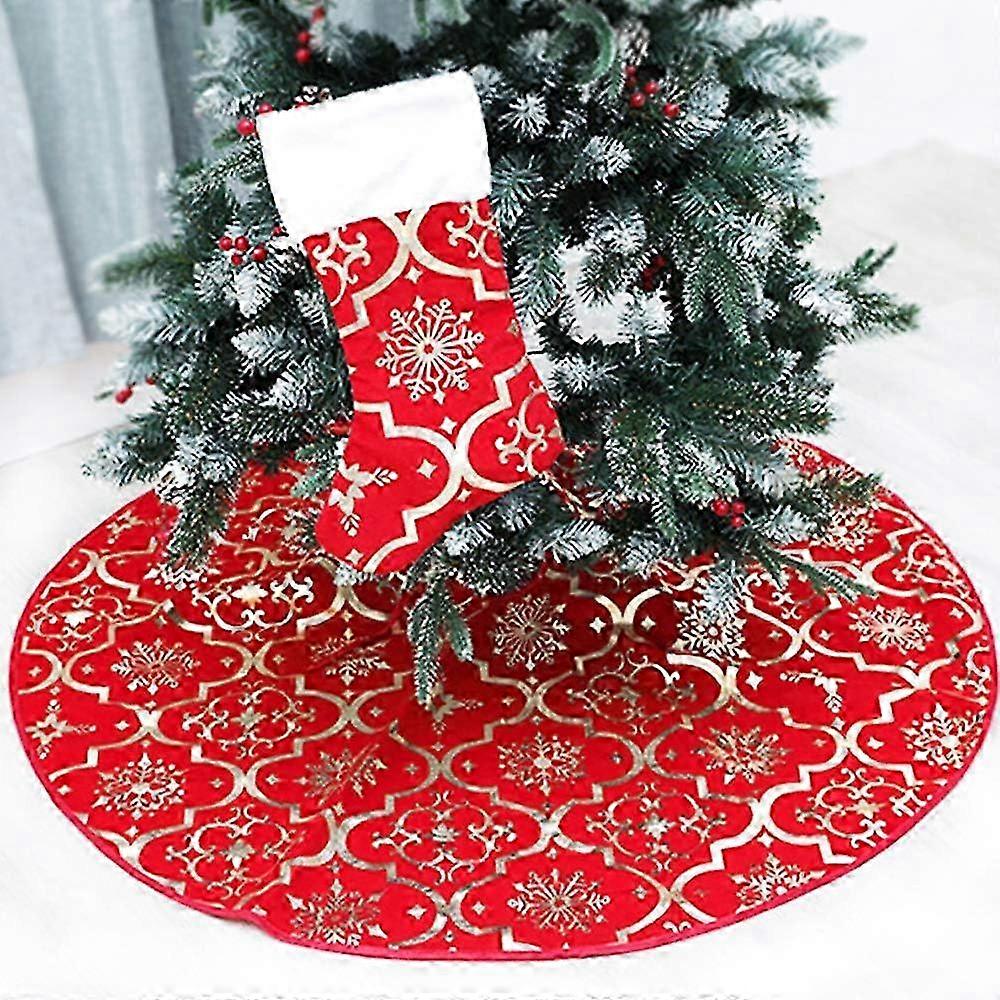 Christmas tree skirt with golden patterns and red flannel base