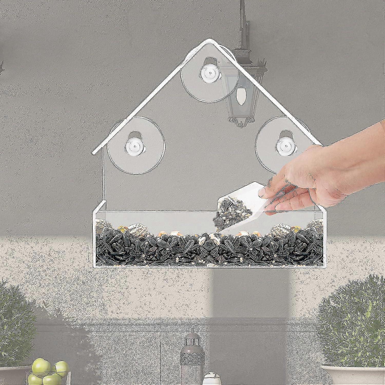 1. Made of high transparency, clear acrylic, so you can study and appreciate the beauty of local birds. Now you can enjoy bird watching from the comfort of your home while sipping your morning coffee, making dinner, or working at your desk 2. The easiest bird feeder to clean, we built a high-end birdhouse for you. The removable tray makes it easy to clean quickly and easily. Simply remove the tray and discard any debris and old seeds. You can also quickly wipe the surface with a damp towel to remove any dirt or water marks. And you don't have to worry aboutstaying moist inside these birdhouses. We made drainage holes in the tray and main feeder so that thecan dry properly. enjoy 3. Happy hour for kids, cats and the elderly Maybe you're looking for a great way to teach your curious kids about nature and birds - or maybe you're trying to keep your lazyentertained all day 4. The perfect gift for bird watchers If you're looking for a thoughtful gift for that animal lover in your life, consider giving them ours 5. Strong suction cups: 3 suction cups per side. The back of the bird feeder makes it securely attached to any window/wooden surface. This window feeder is prefabricated so installation is quick and easy. install/remove. Fill a tray with 1 or 2 cups of seeds. This transparent bird feeder can withstand strong winds, bad weather and even squirrels. To clean, remove oldand clean with a damp cloth.