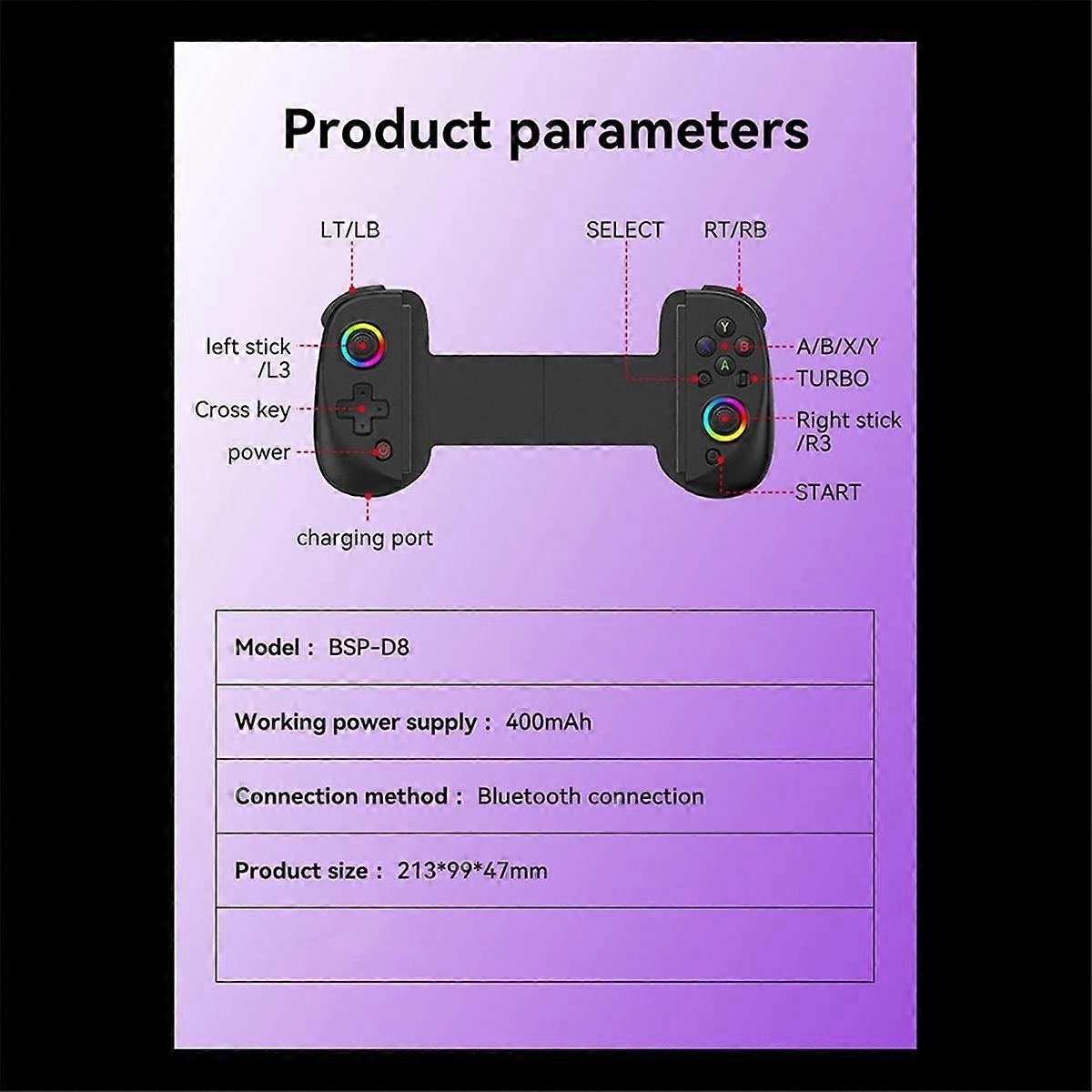 D8 Telescopic Game Controller RGB Light Mobile Game Controller with 6-Axis Vibration for Android IOS PS3 Switch PC,B