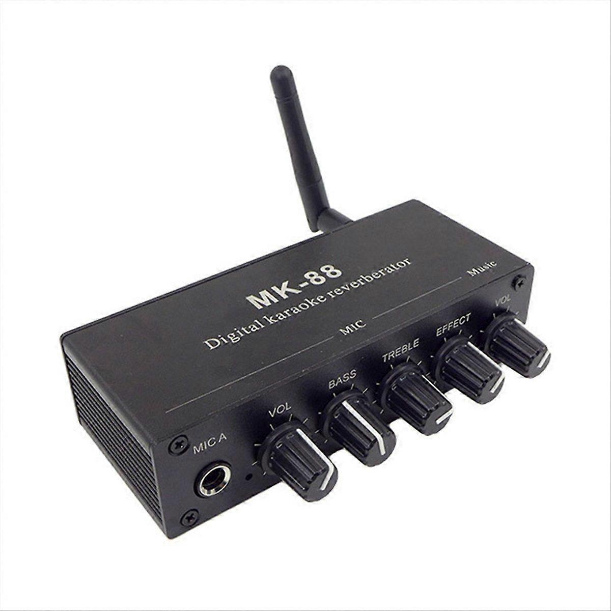 Power supply voltage: 12V DC; Audio input and output: 3.5mm stereo, coaxial input: jack; Supports line-in, coaxial input, and 5.0 Bluetooth audio (Bluetooth name: MK88); Digital reverb, two effect modes, dual microphone input, and and treble adjustment; Paired with a wired or wireless microphone, connect a phone or TV, open a singing app, and connect to a computer's powered speakers or an amplifier for a powerful home karaoke system. Voltage: AC100-240V Plug Type:EU Plug,it applies to Indonesia, Germany, France, Spain, Italy and so on. Color: Black Material: Metal Package Contents: 1 x Audio Amplifier Mixing Board 1 adapter Only the above package content, other products are not included. Note: Light reflection and different displays may cause the color of the item in the picture a little different from the real thing. The measurement allowed error is +/- 1-3cm.