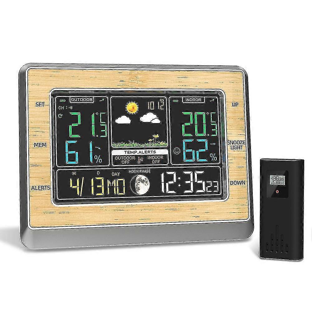 High-precision chip, built-in latest calculation program, can accurately display current time, perpetual calendar, week , indoor and outdoor temperature and humidity, air pressure, moon phase, comcompatible witht, temperature trend and other data, weather compatible withecast accuracy rate of 80% , At the same time, the temperature and humidity alarm function can well meet the needs of professionals (animal and plant breeding), conventional household, office, infant room, outdoor, ward monitoring and other needs.With backlight. DC power supply: 4-level dimming (high light-medium light-low light-off); battery power supply: light on compatible with 10 seconds6-level weather compatible withecast function: sunny, cloudy, cloudy, rain, heavy rain, snowOutdoor transmitterIP54 dust-proof and waterproof, can be hung, can be standing, easy to install, using stable 433.92MHz RF sensing frequency, wireless transmission distance up to 60 meters/100 feetShape: SquareDisplay Type: DIGITALType: Alarm ClocksFeature: CalendarsMotivity Type: DigitalFunction: Snooze Functioncompatible withm: Single Facecolor:Photo colorMaterial:ABSPackage Contents:1 x Multifunction Alarm ClockOnly the above package content, other products are not included.Note: Light shooting and different displays may cause the color of the item in the picture a little different from the real thing. The measurement allowed error is +/- 1-3cm.