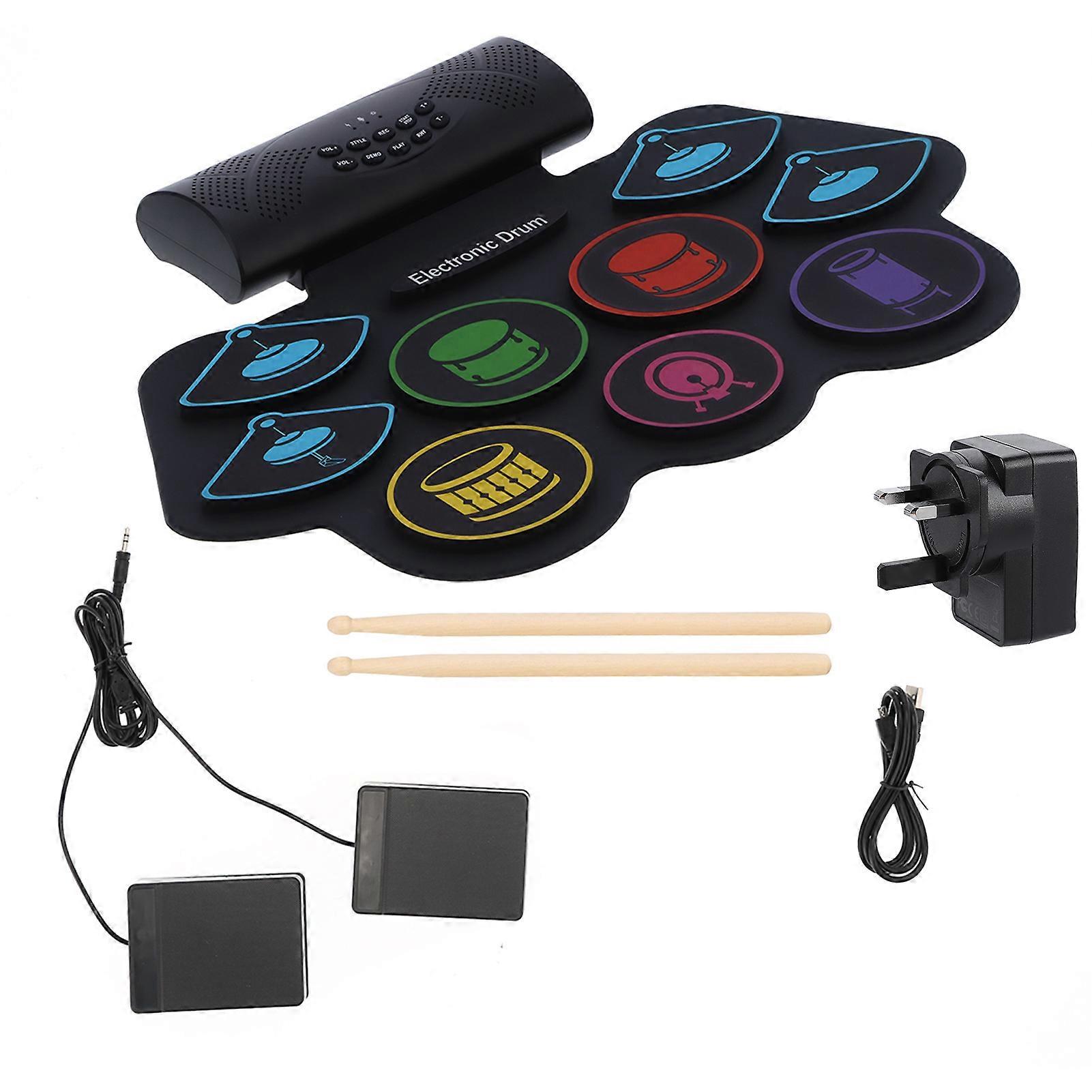 Features: 1.9?drum?pad standard design promises more enjoyable playing experience just like a real drum set. 2.Equipped with dual built?in speakers, sound sources, accompaniments, and recording function. 3.No need to be plugged in, and can be played continuously for about 12 hours when fully charged. 4.USB MIDI port allows for connection to computer, tablet and phone for more convenient playing. 5.The soft and light weight pad can be rolled into a compact size for easier carrying and storage. specification:Item Type: Electronic Drum Pad Set Product Material: Silicone Product Size: Approx. 483 x 324mm / 19 x 12.8in Battery Type: Lithium Battery(Delivered with supporting battery) Battery Capacity: 1000mAh Dual Speakers: Built-in stereo speakers, can be used as audio Product Tone: 10 demo songs, 7 drums, 10 accompaniment Product Functions: MIDI, recording, audio input and other functions. Power Supply: USB/DC 5V rechargeable lithium battery Connected Equipment: Supports MD output, able to connect to computer or tablet to use MIDI software and electronic drum game. PackageList:1 xElectronicDrumPad1 x Pedal2 x Drumstick1 xLithiumBattery1 x USB Cable1x PowerAdapter1 x User Manual Note1. Do not fold and press; 2. When placing, please keep a certain distance from strong electromagnetic equipment such as radio and TV to avoid interference; 3. Please don't put the electronic equipment in overheated or dusty place for work, so as not to damage it; 4. Do not bend or squeeze the electronic battery by 90 degrees or a large angle to avoid damage; 5. During use, without any action for 3 minutes, it will automatically enter the dormant state, and it can be awakened by hitting the drum surface at will.