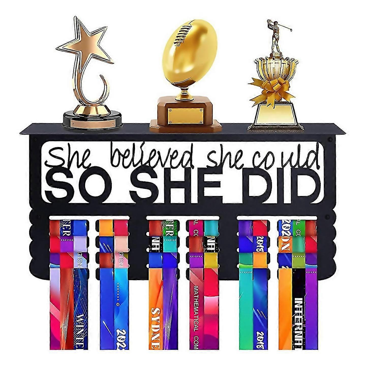 CREATE ART OUT OF YOUR MEDALS: With our medal holder for wall, your childs (or yours) sports medals and trophies wont go missing or collect dust in a drawer or closet; The Never Give Up trophy display shelf motivates you to keep pushing your limits and strive for greatness CAN HOLD MORE MEDALS/TROPHIES: The medal display hanger has 4 rows of hangers (to keep them from falling off) that can hold 64+ medals side by side; Also, the 7.9inch deep x 15.7inch wide shelf is perfect for trophies, pictures, souvenirs, and more WILL NOT BEND OR BREAK: This trophy shelf with hooks for medals but smooth carbon steel that will not bend or break; We also added a fade-proof black coating to the gymnastics medal holder for long-term protection ACCOMPLISHMENTS SHOULD BE CELEBRATED: Our founder believes sports and fitness can enhance your quality of life in countless ways; shes seen it firsthand with her two daughters; The design and quality of this marathon medal display are second to none Style:A Colour:Black Material:M