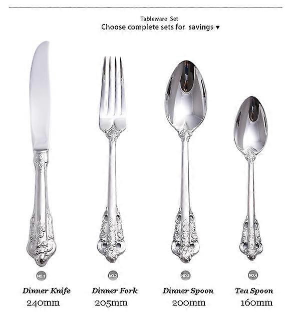 Dinnerware Type:Dinnerware Sets Certification:FDA Certification:EEC Certification:LFGB Certification:CIQ Certification:CE / EU Brand Name:E-SHOW Model Number:304 Stainless steel Technique: Production:Spoon/Fork/Knife/Chopsticks Kit Style:Western Number of Users:1 Feature:Eco-Friendly Pattern Type:Solid Material:304 Stainless steel Material:304 Stainless steel Metal Feature 1:Gold Dinnerware Set Feature 2:Cutlery Set 4 Pieces Black Knife Fork Set Feature 3:Silver Cutleries Western Food Set :00278 Product Weight:280 G Color:gold sliver Fit:Kitchen;Party;Feast Embossed Hollow European Western Style Categories:Kitchen,Dining & Bar > Dinnerware > Dinnerware Sets Package:1 spoon+1 knives+1 forks+1 tea spoons