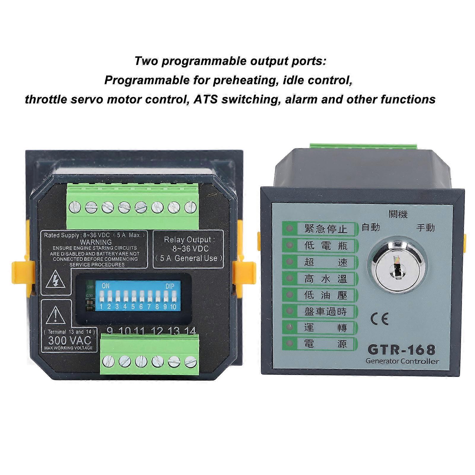 Generator Controller Programmable Quick Response Modes Indicator Genset Control Module DC8‑36V Item Type: Generator Controller Mode: GTR 168 Material: ABS DC Power Supply: DC8-36V (5A MAXIMUM) Power Consumption: Maximum 5 W Frequency Measurement: 0 to 80 Hz Working Temperature Range: -20 ℃ to 60 ℃