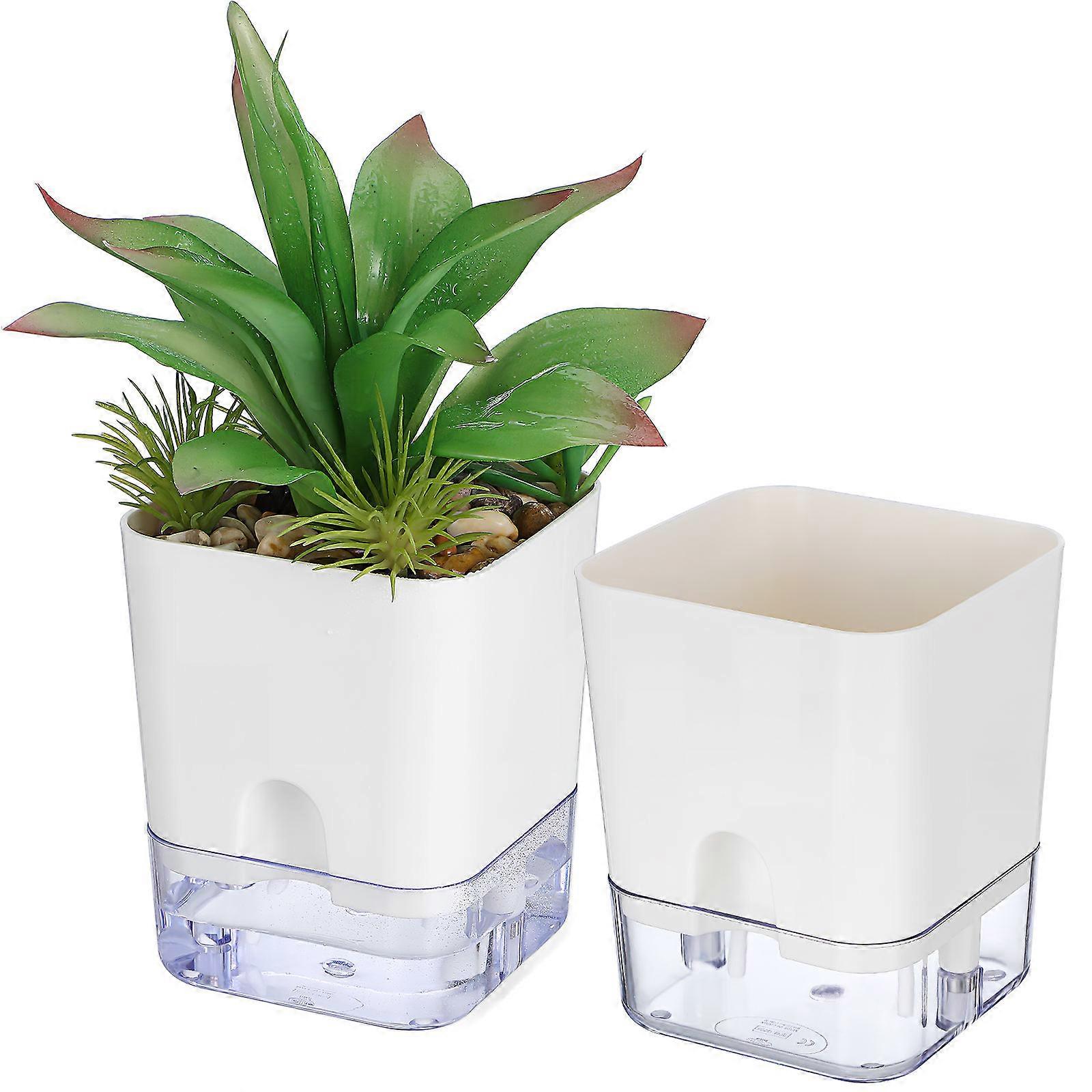 Introducing our Self Watering Plant Pot, suitable for indoor office plants and flowers. With its built-in cotton rope, you can reduce frequent watering. This unique feature allows the plants to receive the right amount of water, ensuring their optimal growth. Features -Color:White -Material:Plastic -Size:14.00X11.50X11.50cm/5.50X4.52X4.52in - Self-Watering System: This indoor planter features a cotton wick that automatically absorbs water, ensuring your plants receive suitable water - Transparent Bottom: The self watering pot's transparent bottom allows you to easily observe the water level, can add water timely - Easy to Assemble: This self watering planter can be easily assembled, making it ideal for planting a variety of flowers and plants - Plastic Material: Made from plastic, this flower pot is both sturdy and resistant to damage, ensuring it will last for a long time - Versatile Usage: With its simple and elegant design, this plant pot is suitable for a wide range of settings, including homes, offices, and hotels Package list: 2 x flower pots