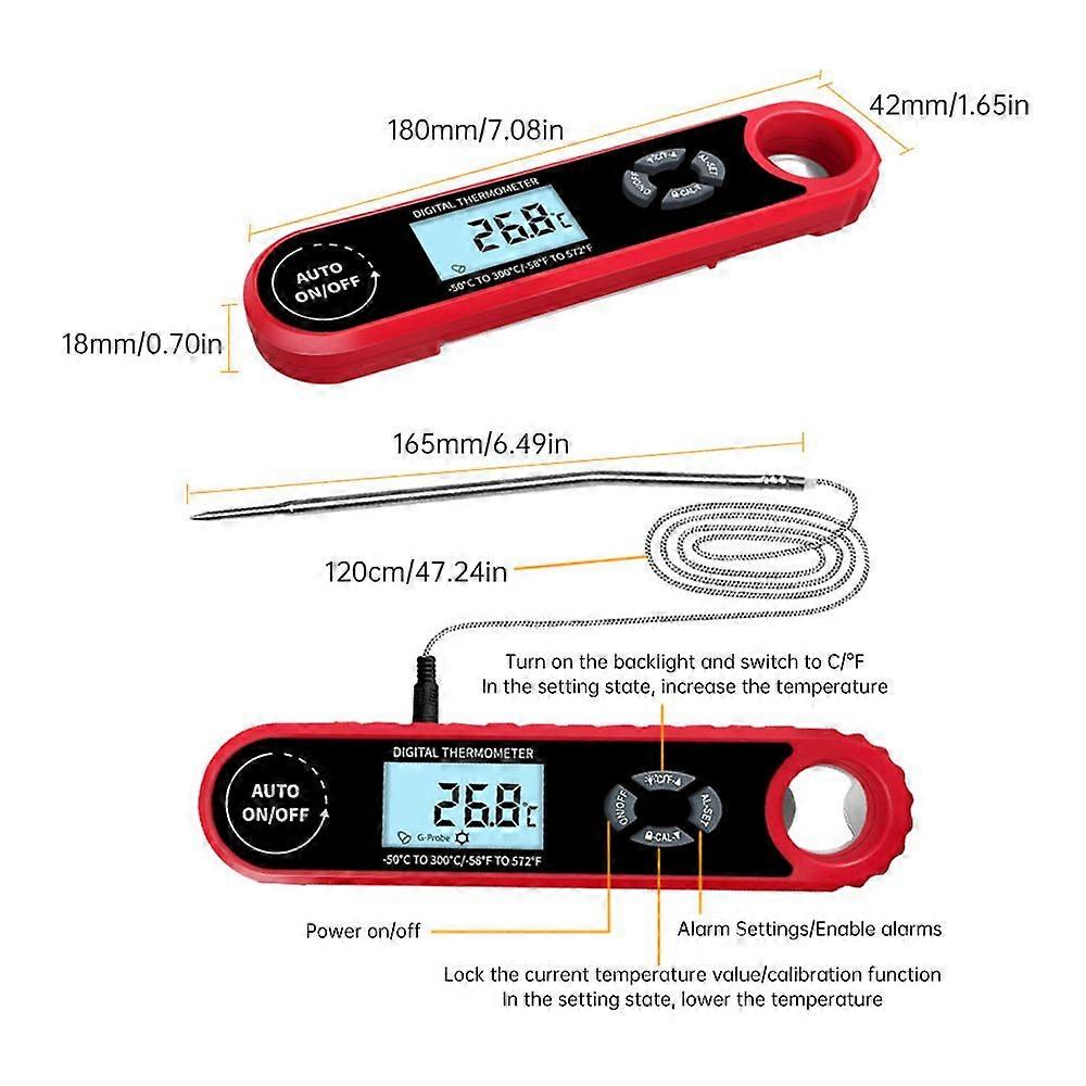 Feature:1. Accurate Temperature Measurement: The 2-3s Meat Thermometer provides precise temperature readings in just seconds. With its dual probes, you can easily measure the temperature of meat or other food items, ensuring they are cooked to perfection every time. The thermometer has a measurement accuracy of 0.8C, giving you confidence in the accuracy of your cooking.2. Versatile and Convenient: This 2-in-1 Food Thermometer is not just for meat. It can also be used for baking, grilling, and even monitoring the temperature of your oven. The C/F switch allows you to easily toggle between Celsius and Fahrenheit measurements. The LCD screen with a large 1.78\" display makes it easy to read the temperature, even from a distance.3. Intelligent Design: The Cooking Thermometer is equipped with gravity sensing technology, which means the display automatically rotates to the correct orientation, no matter how you hold it. This makes it easy to read the temperature without any inconvenience. The back of the thermometer is equipped with a strong magnet, allowing you to attach it to metal surfaces for easy storage and access.4. Alarm Function and Backlight Display: The Digital Meat Thermometer features an alarm function that alerts you when the desired temperature is reached, preventing overcooking or undercooking. The backlight display ensures that you can easily read the temperature even in low-light conditions, making it perfect for use in outdoor grilling or dimly lit kitchens.5. Durable and Waterproof: With an IP65 waterproof rating, this Instant Read Meat Thermometer is designed to withstand splashes and spills, making it safe to use in the kitchen or even outdoors. The thermometer is powered by a single CR2032 button battery, providing long-lasting power for all your cooking needs. Its compact and portable design makes it a must-have tool for every kitchen and BBQ enthusiast.Specification:Features:Accurate Temperature Measurement: The 2-3s Meat Thermometer provides precise temperature readings in just seconds. With its dual probes, you can easily measure the temperature of meat or other food items, ensuring they are cooked to perfection every time. The thermometer has a measurement accuracy of ±0.8°C, giving you confidence in the accuracy of your cooking.Versatile and Convenient: This 2-in-1 Food Thermometer is not just for meat. It can also be used for baking, grilling, and even monitoring the temperature of your oven. The °C/°F switch allows you to easily toggle between Celsius and Fahrenheit measurements. The LCD screen with a large 1.78" display makes it easy to read the temperature, even from a distance.Intelligent Design: The Cooking Thermometer is equipped with gravity sensing technology, which means the display automatically rotates to the correct orientation, no matter how you hold it. This makes it easy to read the temperature without any inconvenience. The back of the thermometer is equipped with a strong magnet, allowing you to attach it to metal surfaces for easy storage and access.Alarm Function and Backlight Display: The Digital Meat Thermometer features an alarm function that alerts you when the desired temperature is reached, preventing overcooking or undercooking. The backlight display ensures that you can easily read the temperature even in low-light conditions, making it perfect for use in outdoor grilling or dimly lit kitchens.Durable and Waterproof: With an IP65 waterproof rating, this Instant Read Meat Thermometer is designed to withstand splashes and spills, making it safe to use in the kitchen or even outdoors. The thermometer is powered by a single CR2032 button battery, providing long-lasting power for all your cooking needs. Its compact and portable design makes it a must-have tool for every kitchen and BBQ enthusiast.Specification:Product material: Environmentally friendly ABS plastic + 304 stainless steel probeProduct size: 180 x 42 x 18mm / 7.09 x 1.65 x 0.71inProbe length: 108mm / 4.25inExternal probe length: 165mm / 6.49inProbe cable length: 120cm / 47.24inProduct weight: 111g / 3.92ozProduct color: RedBattery: 1*3V 210mAh CR2032 button cell (Included)Temperature measurement range: -50 - 300°C /-122 - 572°FAccuracy: ±0.8°CTemperature measurement speed: 2-3sWaterproof grade: IP65Packing List:1 x Meat Thermometer1 x External Probe1 x CR2032 Battery1 x Cover Opening Plate1 x Temperature Guidelines1 x ManualPackage List:1 x Meat Thermometer1 x External Probe1 x CR2032 Battery1 x Cover Opening Plate1 x Temperature Guidelines1 x Manual