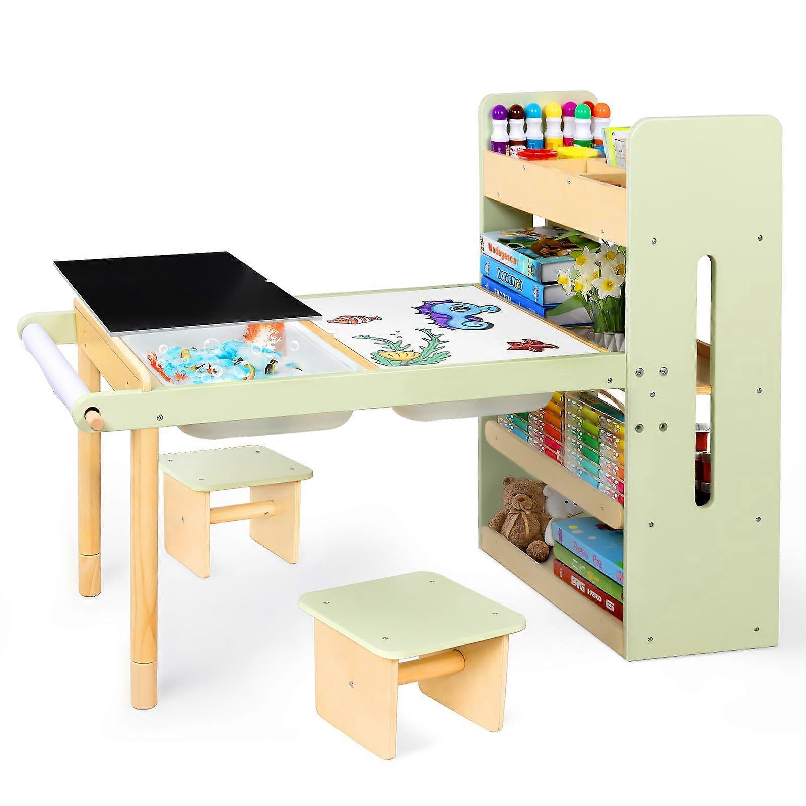 Kids Art Table with Storage and Chairs, Adjustable Height Activity Desk with Sensory Bins, Blackboard and Whiteboard for Toddlers