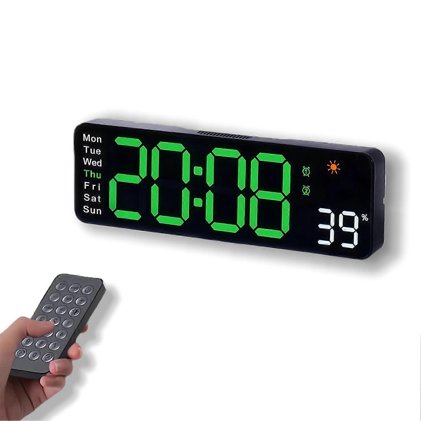 Large LED Digital Wall Clock with 11' Display, Remote, Auto Dimming, Temperature and Date, Green