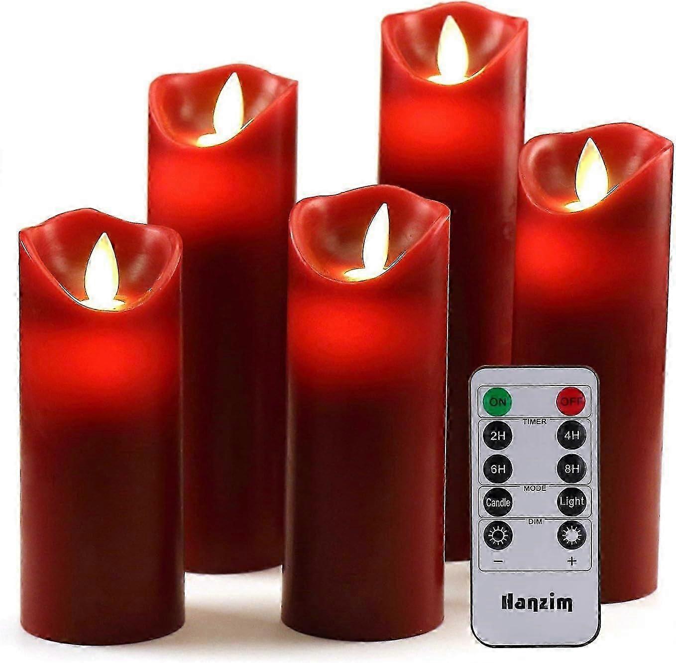 A COMPLETE SET OF FLAMELESS CANDLES: This set comes with 5 beautiful flameless column candles, 1 remote control with 10 different keys and a super easy to understand user manual. Specifically, this set includes one 4", one 5-post, one 6", one post, one 7" and one 8" (each 2.2" in diameter), all with elegance. A burgundy red that suits any home.(Battery is not included in this package.) Energy saving, powerful LEDs: These stunning candles require 2 AA batteries per candle and should last approximately 150 hours, while LEDs last up to 50,000 hours.Unlike candles, these flameless pillar candles are built to last; you buy once and have them forever Worry-Free Operation: For easy operation from the comfort of your couch or bed, you'll also get a 16.4-foot remote to operate all the candles. This 10-button remote lets you set a 2-hour, 4-hour, 6-hour, or 8-hour timer on the flameless column candle, and you can even program it to automatically turn on or off. Enjoy relaxing, carefree candlelight with this super handy remote control Safety First: With flameless candles, you can enjoy the perfect night with peace of mind; no need to worry about fire hazards, smoke, messy wax drips or stained tablecloths. These child-friendly white flameless candles are ideal for families with children or pets who want to keep their children safe and sound Perfect flameless candle decoration: these twinkling LED candles are a beautiful addition to your any dinner, work table, bedside table, Christmas decorations and more. The flame stimulation technique makes these beautiful, flickering, flickering candles so beautiful and compelling that you and your guests are sure to be impressed. Product Description Get started today: replace your traditional candles with the trendiest flameless burning candles and enjoy their relaxing effects in peace! Are you still worried about the danger of fire or a possible dangerous accident? home! Designed to exceed your expectations, this set includes 5 elegant LED pillar candles that bring a nice touch of ambiance to your dining room, bedroom, and even bathroom without posing the threat commonplace among true pillar candles. This set of 5 classic flicker flameless candles is a great alternative to traditional candles and can be used for many occasions. very suitable: special parties, events, dinners birthday party Christmas decoration as a bedside table Ambient nights for gardens, terraces, camping Restaurants, bars, shops, etc. Really convincing sustained burning effect! Powered by 2 AA batteries each (not included) These LED candles can last up to 50,000 hours, making them a more economical solution than real candles, which can last up to several hours before they burn out. > What's the best part? For your convenience, these candles can be easily operated with the included remote control, while they have an automatic on/off timer function for 2h/4h/6h/8h. Don't waste it - order get it today!