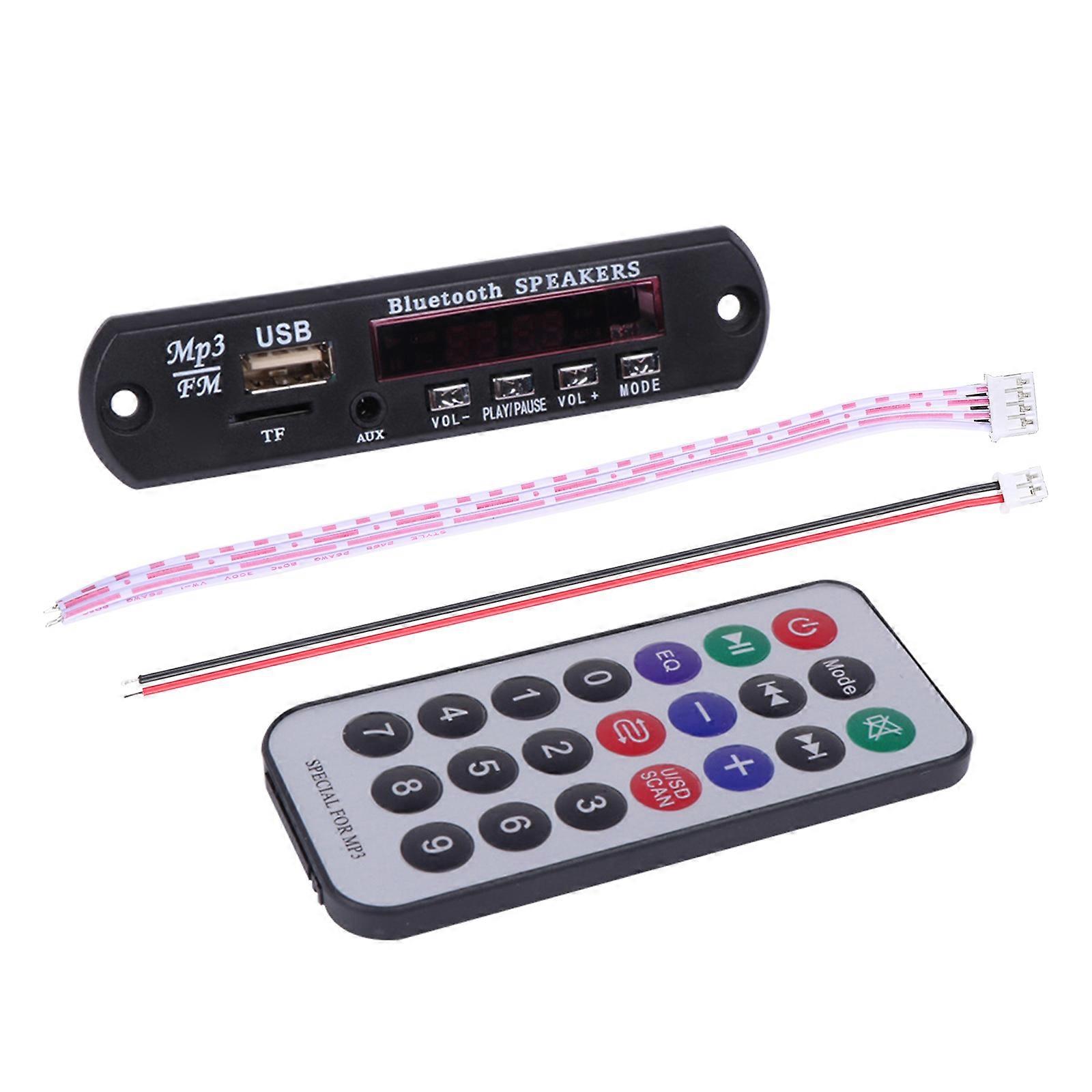 Features: brand new and high quality Dual decoding supports MP3/WMA/WAV/FLAC/APE lossless format music. Support for MMC/SD/MMA and other cards, support USB interface (U disk). Buttons: Four-button multi-directional control, VOL-/AUTO/VOL+/MODE. Support radio FM, search frequency band (87.5MHZ-108.0MHZ). Power-off memory function; support bt function, bt version 5.0; with digital tube display. Specifications: Material: ABS Color: As the Picture Shows Product Dimension: approx. 108x25.6mm/4.25x1.04inches Net Weight: 40g/0.09lbs Note: Please allow 1-2cm errors due to manual measurement. Due to the difference between different monitors, the picture may not reflect the actual color of the item. Package includes: 1Set Mp3 Decoder Board Usb Decoder