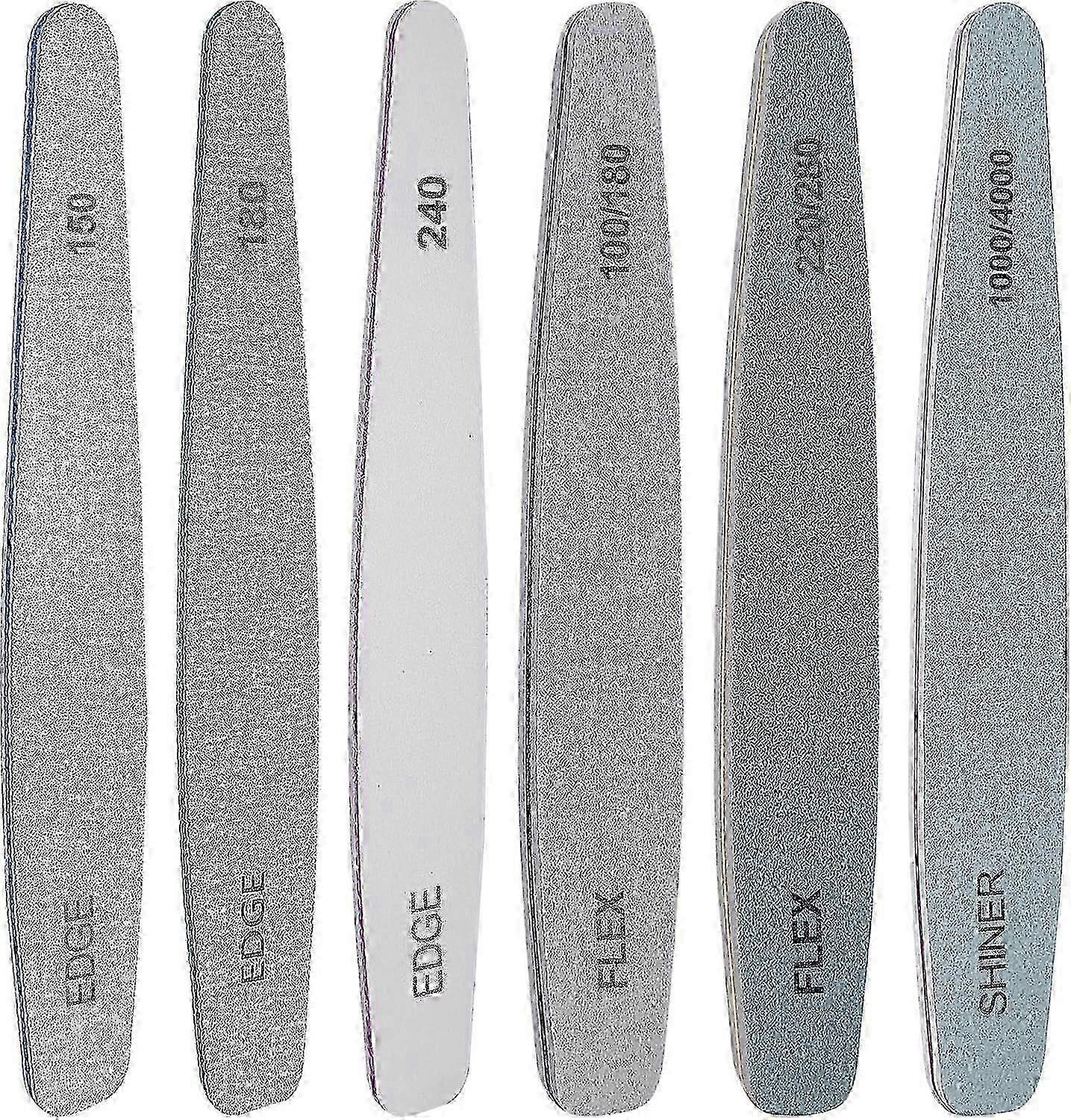 Upgraded Materials for Durable and Precise Nail Care: Expertly crafted with top-quality materials of emery board and sandpaper, these nail files and buffers are built to last and deliver precise results as you expected. Each nail file in the nail filer and buffer set with different grit provides you a comfortable nail care experience. Whether you're a seasoned nail technician or a beginner, our nail file and buffer set consistently deliver salon-quality results.<br> Wide Usage and Easy Maintenance: Our nail buffer file set is a breeze to clean and maintain, washable, reusable, ensuring they remain in top . Compact and lightweight, they are perfectly portable for travel or home use. Whether you want to remove gel nails, shape acrylic nails, extended nail, fake nails, buff and shine natural nails, this nail filing kit has you covered. It is also an awesome gift for those who love nail art DIY as birthday gift, Christmas gift or other holiday gift.<br> What You Get: You'll receive a set of 6 grit nail files, each equipped with double-sided 150/150, 180/180, 240/240, 100/180, 220/180, 1000/4000 grit from . We have full confidence in the superior quality of our nail files. Treat yourself to the pleasure from top-tier professional nail files.<br> Complete Nail Care Kit: Our nail filing kit, including professional nail files and buffers, limas para unas acrilicas profesional, guarantees your nails are always in perfect shape. These manicure kit work quickly to trim the acrylic nail with your desired shape or length and shine your nails as you wish. Keep your nails looking perfect with this all-in-one solution, ideal for soft nail files, nail buffers, and acrylic nail files and buffers alike.<br> Different Grit Levels: Our nail file and buffer set offer various grit options, ensuring you have everything you need for flawless nail care. From soft nail files (150/180/240 grits) to a nail filer and buffer set (1000/4000 grits), these nail buffers include EDGE 150 grit Cushioned Board, EDGE 180 grit Cushioned Board, EDGE grit 240 Cushioned Board, FLEX 100/180 grit Buffer, FLEX 220/280 grit buffer, FLEX 1000/4000 grit Shine butter.