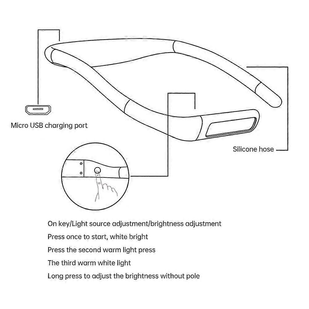 Feature: 1. - 3-color light source: You can choose cold white light, warm white light or natural light. The 11pcs high-quality LED light source provides clear and soft light to meet the reading needs in different scenarios. Whether you are focusing on studying, working or reading for leisure, it will be your best choice. 2. - 270° rotating lamp head: The light direction can be adjusted as needed, without dead angle lighting, providing a better reading experience. 3. - Infinitely adjustable brightness: You can easily adjust the light brightness (3000-6000K) according to personal preferences and ambient light to reduce eye fatigue. 4. - Long-lasting battery life: Built-in 1800mAh large-capacity battery, one charge can support 8hrs long-term use (at the brightest condition), convenient for business trips, travel and other occasions. 5. - Can be hung around the neck or desktop: The soft silicone tube body can be hung around the neck to free your hands; it can also be placed on the desktop and used as a desk lamp, which is flexible and diverse. Specification: Model: GH-8 Size: 250x160x30mm Weight: 150g Material: ABS+Silicone Color: Black, White (Optional) Power: <2.5W Battery: 18650 Lithium Battery 1800mAh Battery life: 8 hours at brightest, 80 hours at darkest Charging time: 4 hours Number of lamp beads: 11 Color temperature: 3000-6000K Lighting brightness: 50-150 lumens Waterproof rating: IPX4 Light Color: Warm, White, Warm-White Interface: Micro-USB Package List: 1 x LED Light 1 x Charging Cable 1 x User Manual