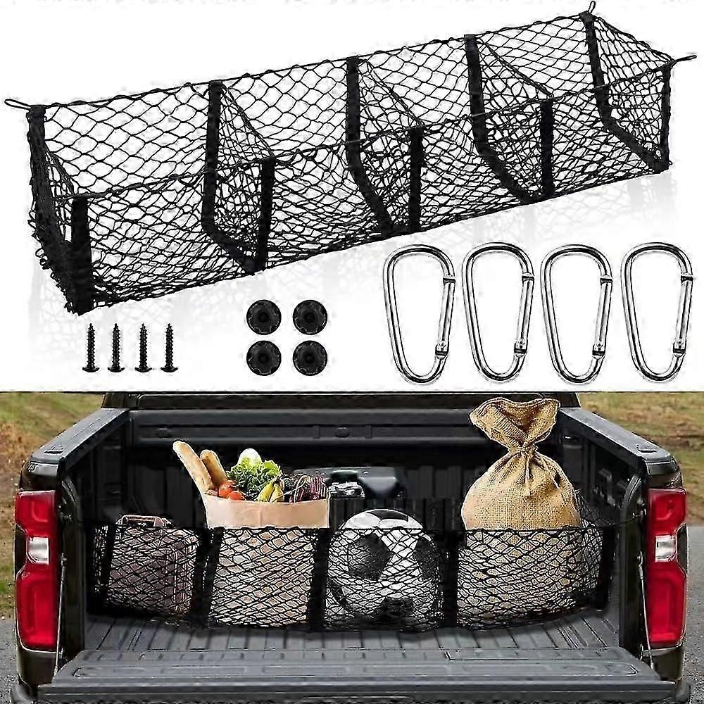 1. VERSATILE STORAGE: Quadruple truck bed cargo net organizer for securing food, sports equipment, tools, and other items while driving. 2. COMPLETE INSTALLATION KIT: Includes 4 metal carabiners and mounting screws to securely attach to your truck bed for easy setup. 3. DURABLE CONSTRUCTION: Durable mesh designed to withstand regular use and various weather conditions while maintaining shape and functionality. 4. UNIVERSAL COMPATIBILITY: Fits most pickup truck beds and can be easily adjusted or repositioned as needed for storage configuration.