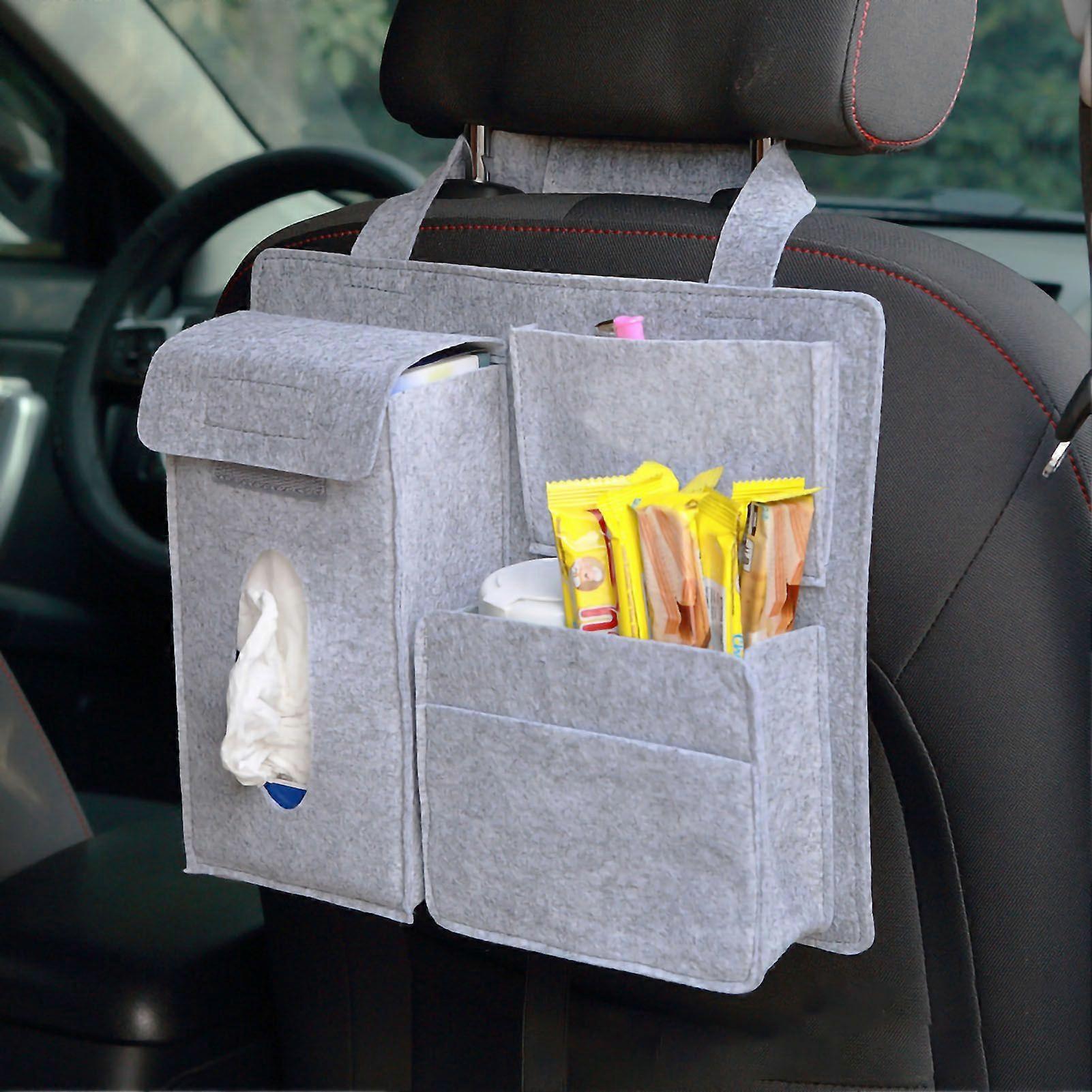 Rear seat car storage bag with hook and loop fasteners