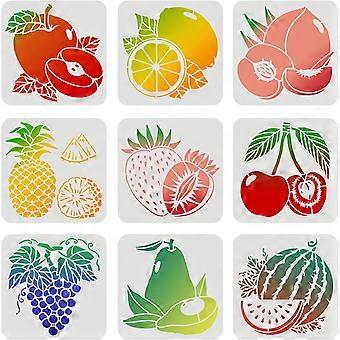9 kpl hedelmäsapluunoita (19,4 cm x 19,4 cm) – ananas, sitruuna, vesimeloni, persikka, päärynä, kirsikka, mansikka, viinirypäle – uudelleenkäytettävät muovisapluunat puulle