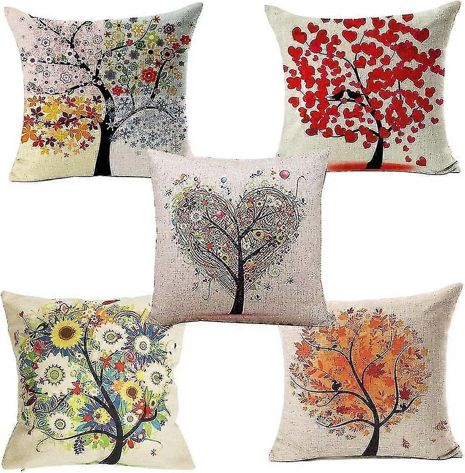 Set Of 5 Cushion Covers Featuring Four Season Tree Design, Square Pillowcases for Hull House Sofa, Suitable for Various Decor Styles