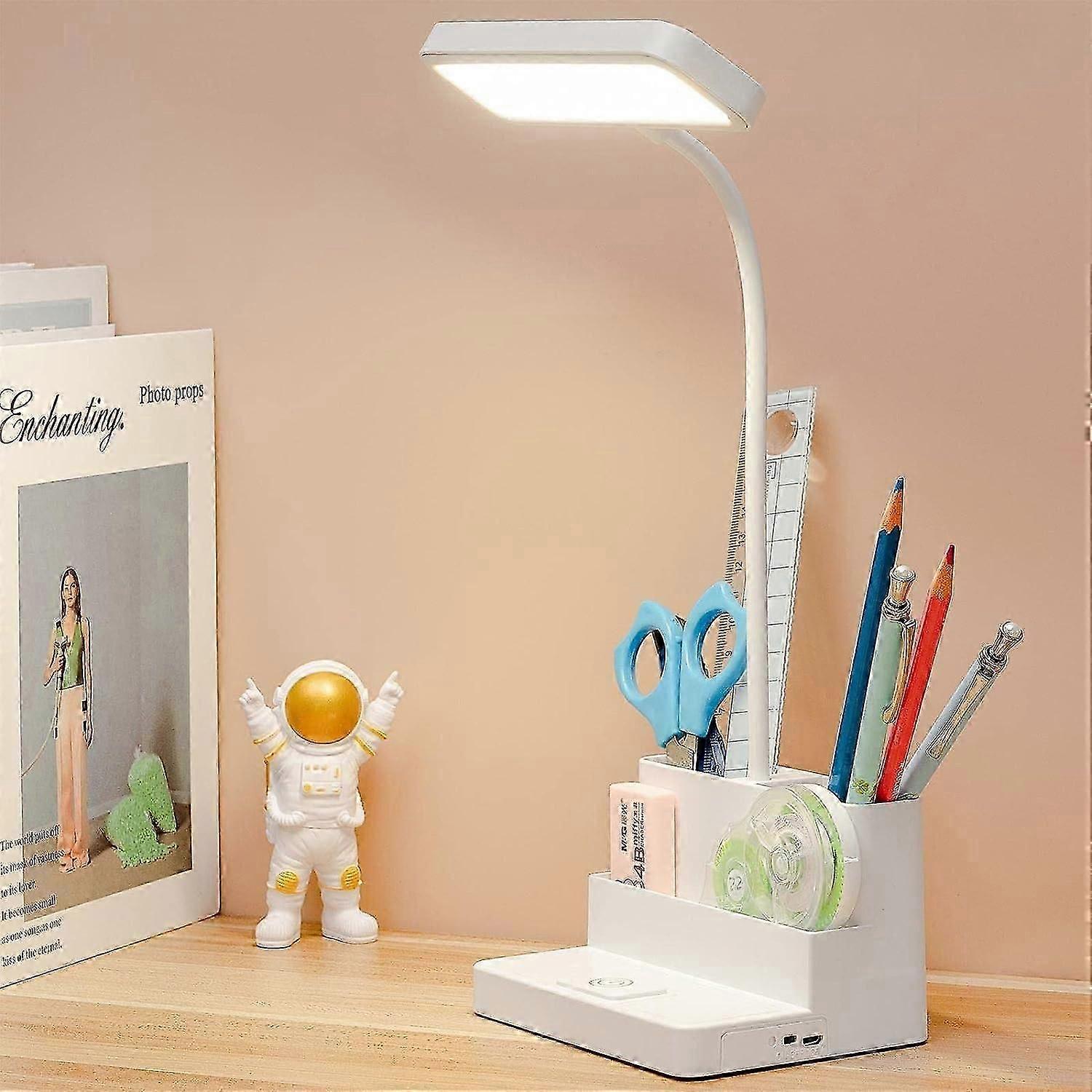 Small LED Desk Lamp with Pen and Phone Holder - Rechargeable Flexible Gooseneck Light, 3 Colour Modes and Stepless Dimming for Eye Care Study