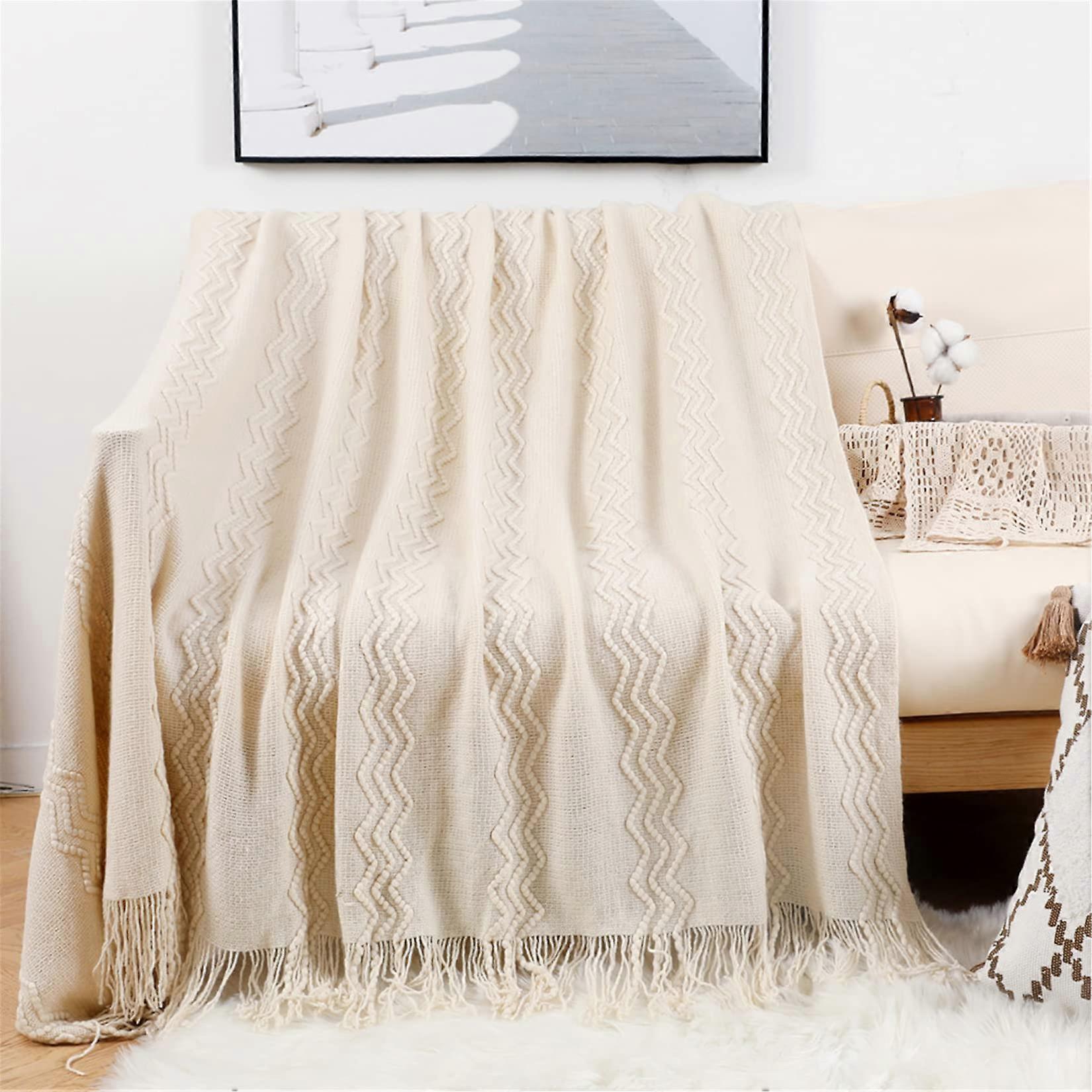 Sofa Blanket, Soft Knitted Boho Throw Blanket with Tassels, Cuddly Couch Blanket in Beige, 130 x 150 cm