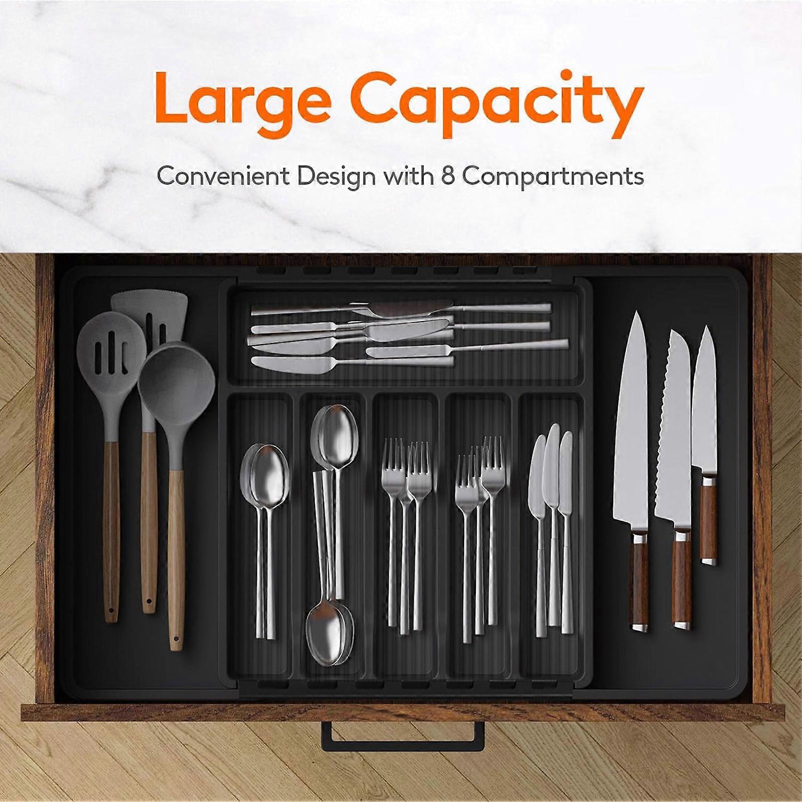 SUSUchens Cutlery Storage Box, Large Capacity Expandable Organizer with Multi Compartments for Forks, Chopsticks, Spoons - Black, Size L