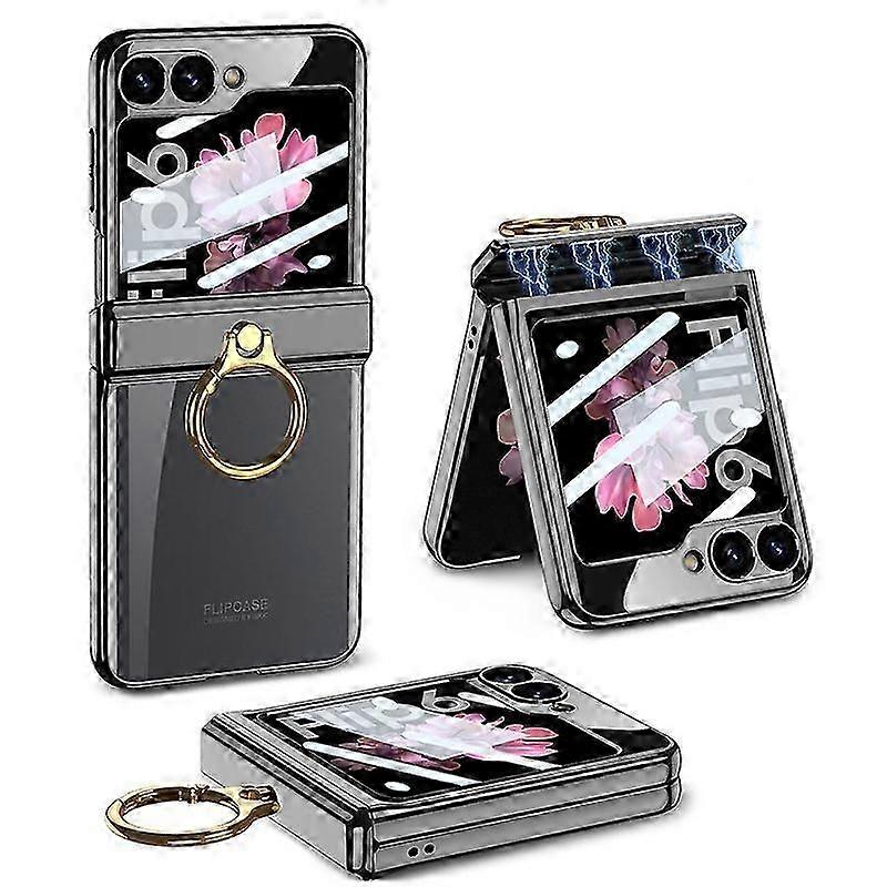 For Samsung Galaxy Z Flip 6 Case with Ring Holder Magnetic Hinge Coverage Protective Transparent Plating PC All-Inclusive Cover